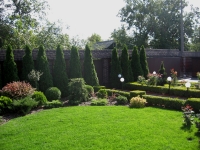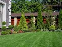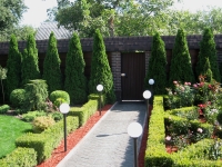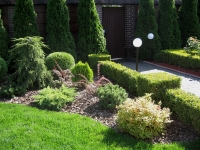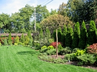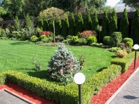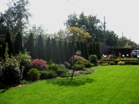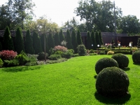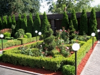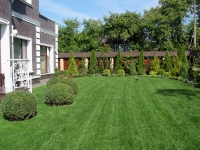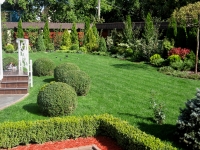 Благодаря тщательному уходу садовника, проводятся регулярные процедуры по стрижке, подкормке и обработке растений и газона. Как следствие - сад выглядит презентабельно, нарядно и ухоженно.