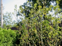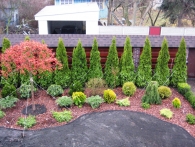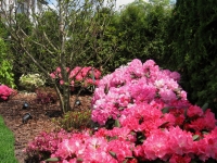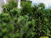 В основном на участке преобладают хвойные растения. Представлены всевозможные виды и формы, которые отличаются по окраске хвои (от золотистого до сизо-голубого) и по форме кроны (шарообразные туи, разлогие и колоновидные можжевельники, плакучая тсуга). Дополняют их декоративно-лиственные и цветущие кустарники. Они наполняют сад нежным ароматом весеннего цветения и поражают своей красотой. Так угловая композиция магнолии лилиецветной и рододендронов не оставит никого равнодушным. А осенняя окраска листьев (от желто-оранжевого до ярко-красного цвета) различных видов барбарисов, бересклета крылатого, спиреи японской, клена остролистного выделяется на фоне зеленой хвои.