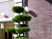 Парадная зона должна была стать «визитной карточкой» хозяев участка. Чтобы она всегда выглядела стильно и ухожено мы использовали большое количество топиаров (спиралей, кубов, шаров, бонсаев) и партерный газон. Перед домом разбили розарий строгой геометричной формы. Его истинным украшением стали две спирали из тиса ягодного и шарообразная туя западная ‘Danica’ по краям. А тщательно подобранные розы обрамлены формированной изгородью из самшита.