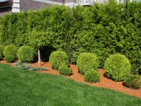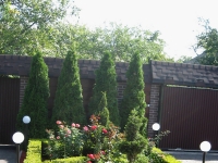Приватная зона отделена от стоянки плотной высокой изгородью из туи западной ‘Brabant’. С ее помощью мы получили эффект закрытого пространства, где хозяева могут чувствовать себя уютно и уединенно.