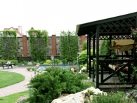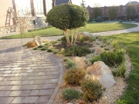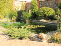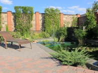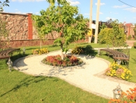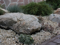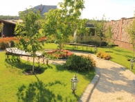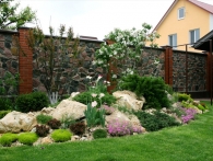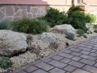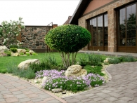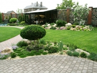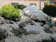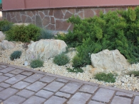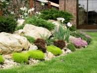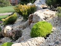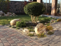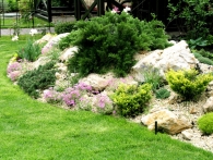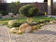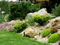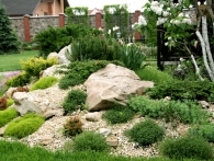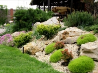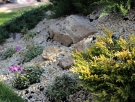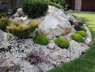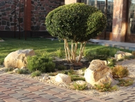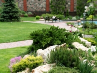 Обязательное условие заказчика: зона отдыха должна сохранять декоративный вид на протяжении всего года. Для альпийской горки были тщательно подобраны многолетники и декоративноцветущие кустарники, радующие глаз своими красками в теплое время года. Из больших и маленьких камней здесь выложены изящные красочные пятна, а в качестве основного покрытия использована крошка. Вертикальными акцентами послужили слива Нигра и сирень. Для поддержания объема композиции в зимний период были высажены хвойные: можжевельники, карликовые сосны и эксклюзивный самшит зонтичной формы.